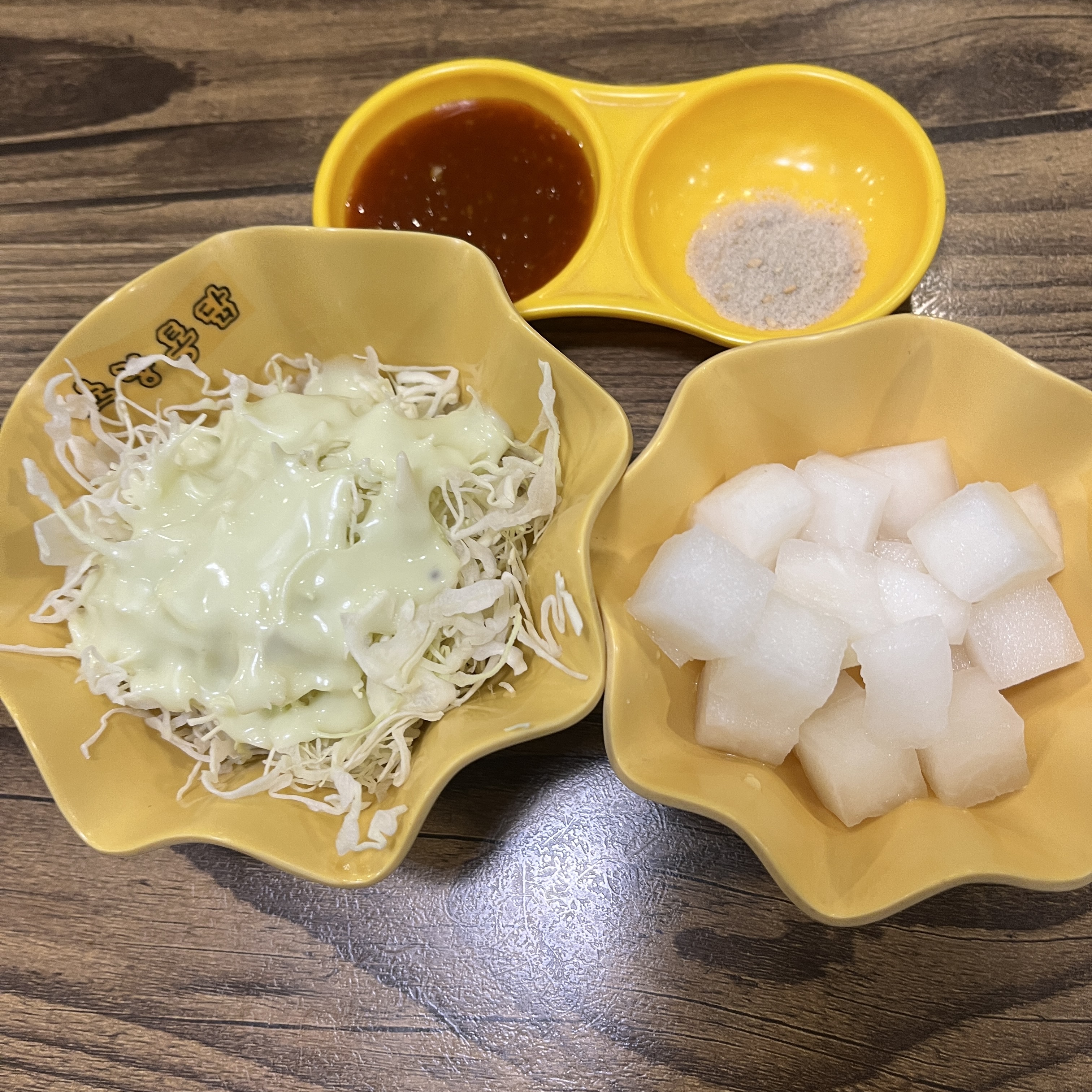기본으로 나오는 샐러드, 치킨무, 소금, 양념입니다.
