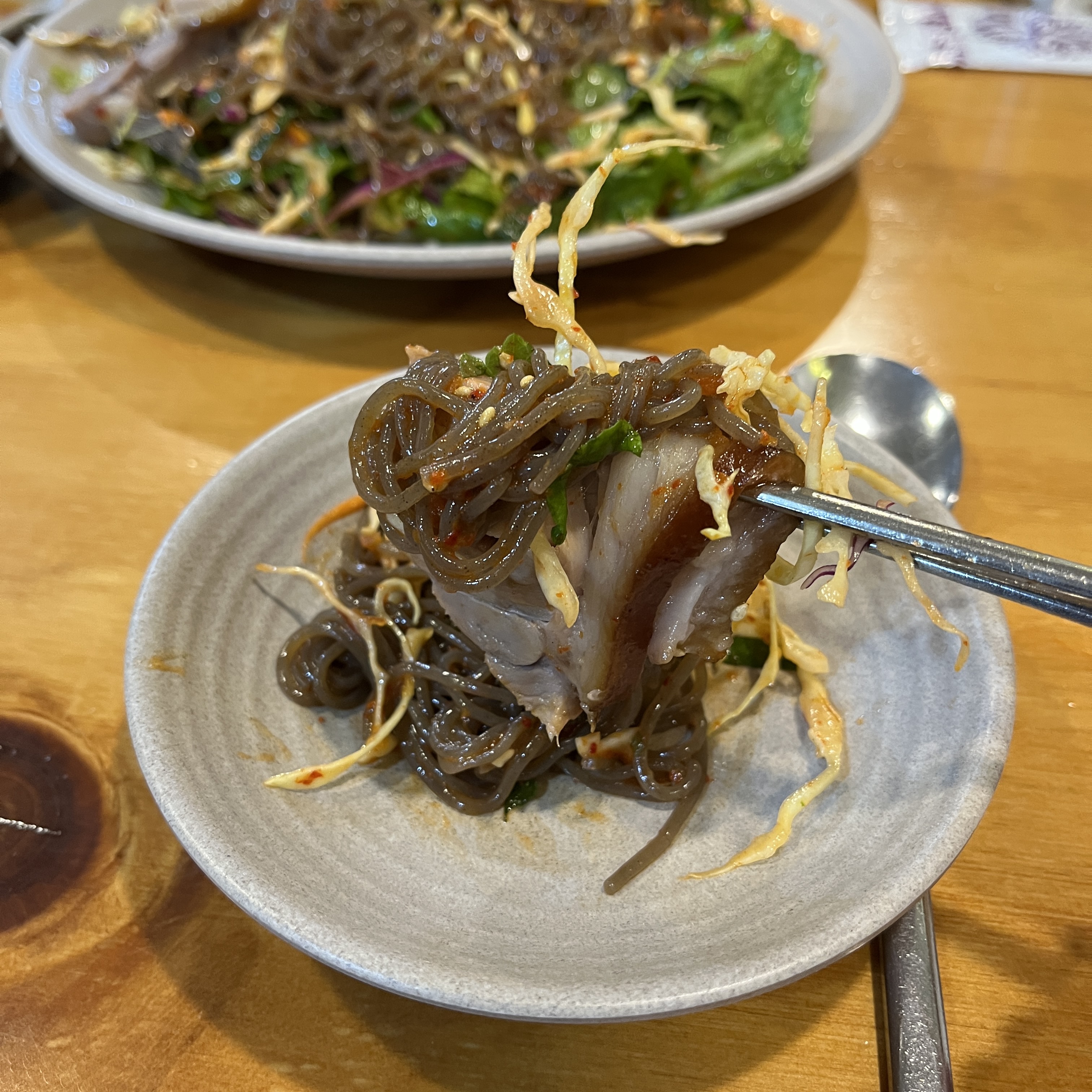 족발의 맛을 해치지 않으면서 감칠맛과 쫄깃한 식감만 더해주는, 아주 어떻게 하면 족발과 잘 어울리는 막국수일지에 대한 정석을 보여주는 맛이랄까요?