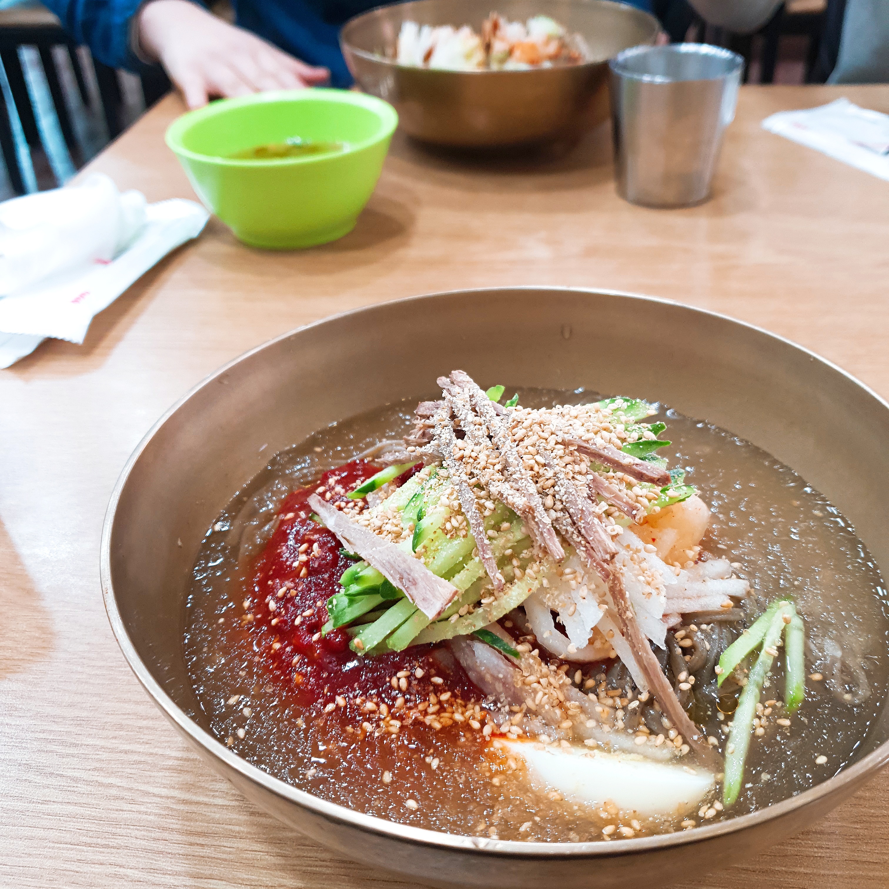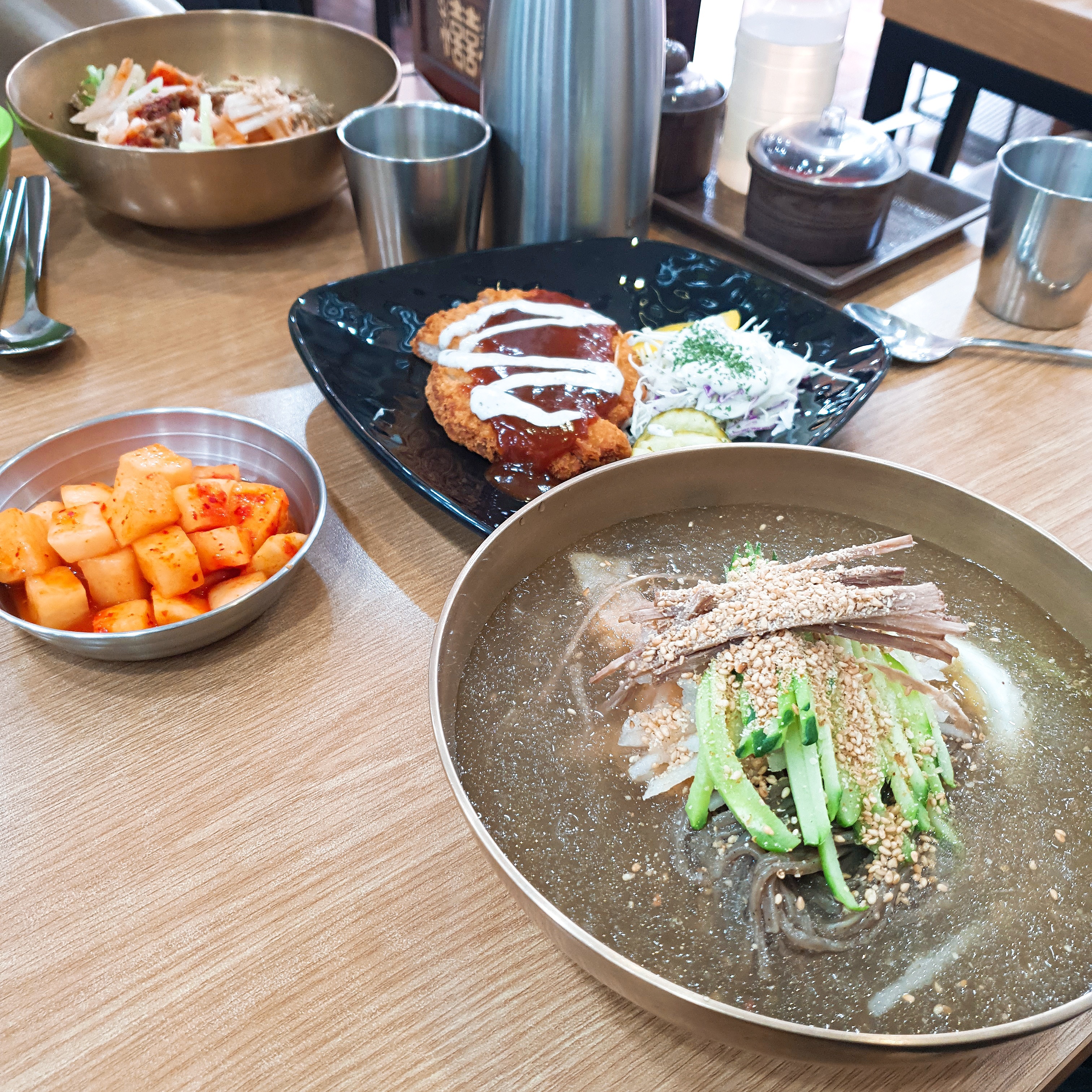 육개장이나 장조림에 들어갈만한 고기가 고명으로 얹어져 있어 쫄깃한 식감을 느끼게 해줬고, 오이 무채 등이 아삭아삭한 식감을 더해줬습니다.