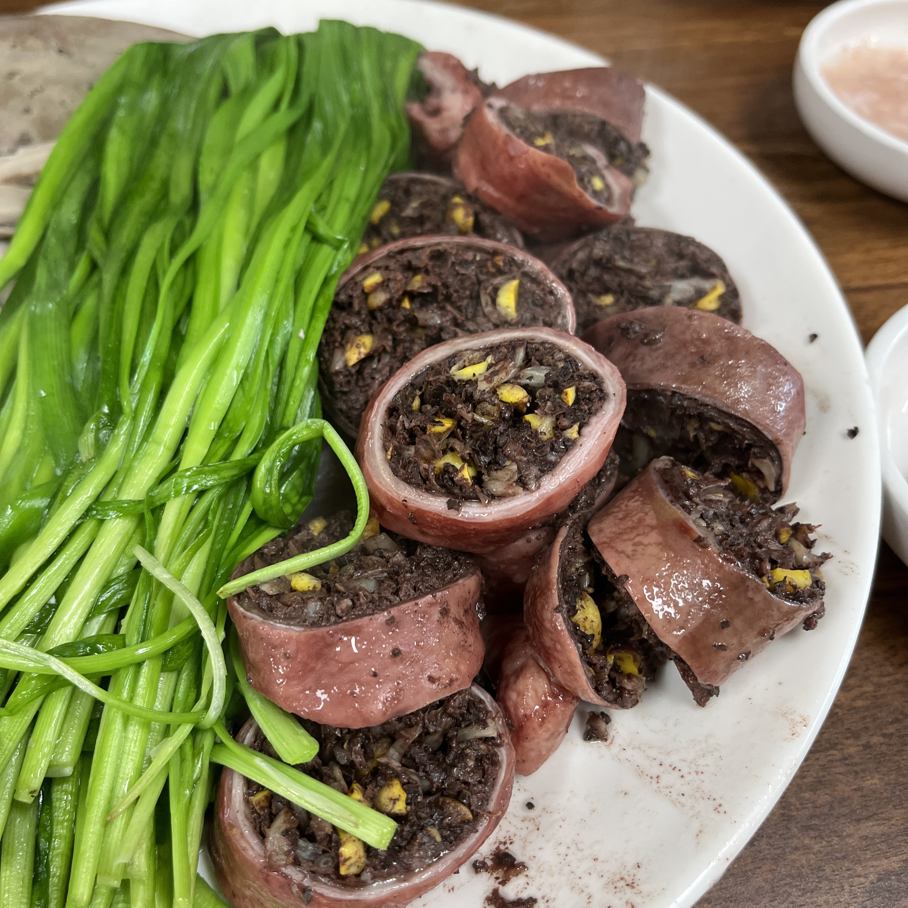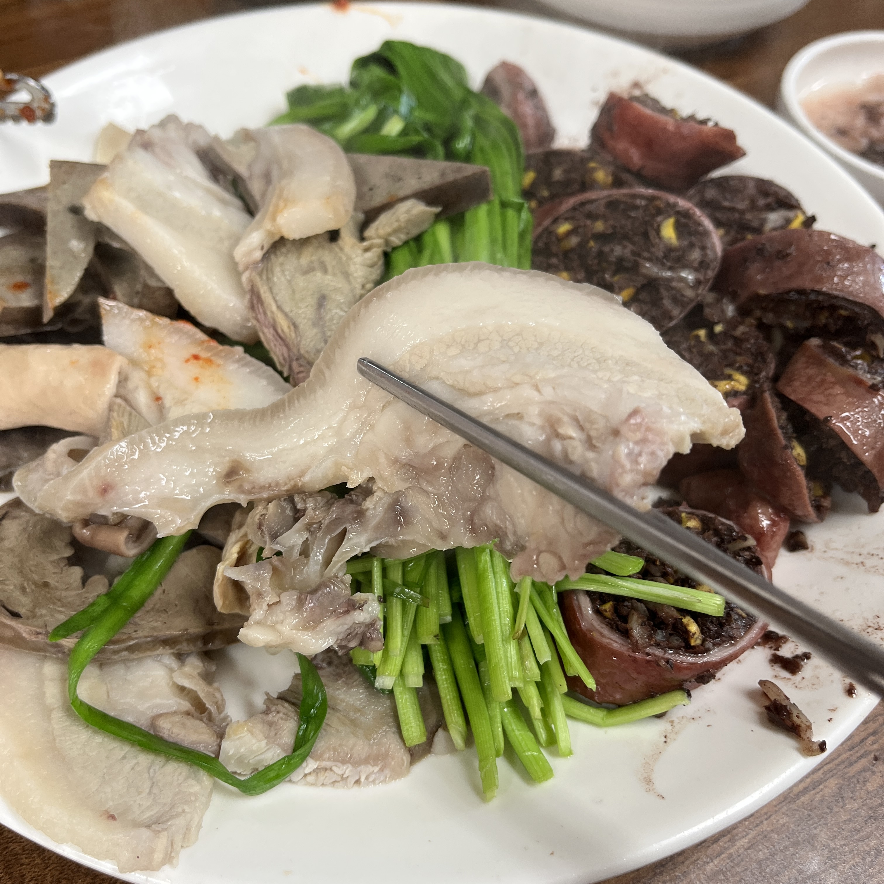 순대 육수에 살짝 데쳐서 나온 부추가 고기에 곁들여 먹으면 진짜 맛있죠!