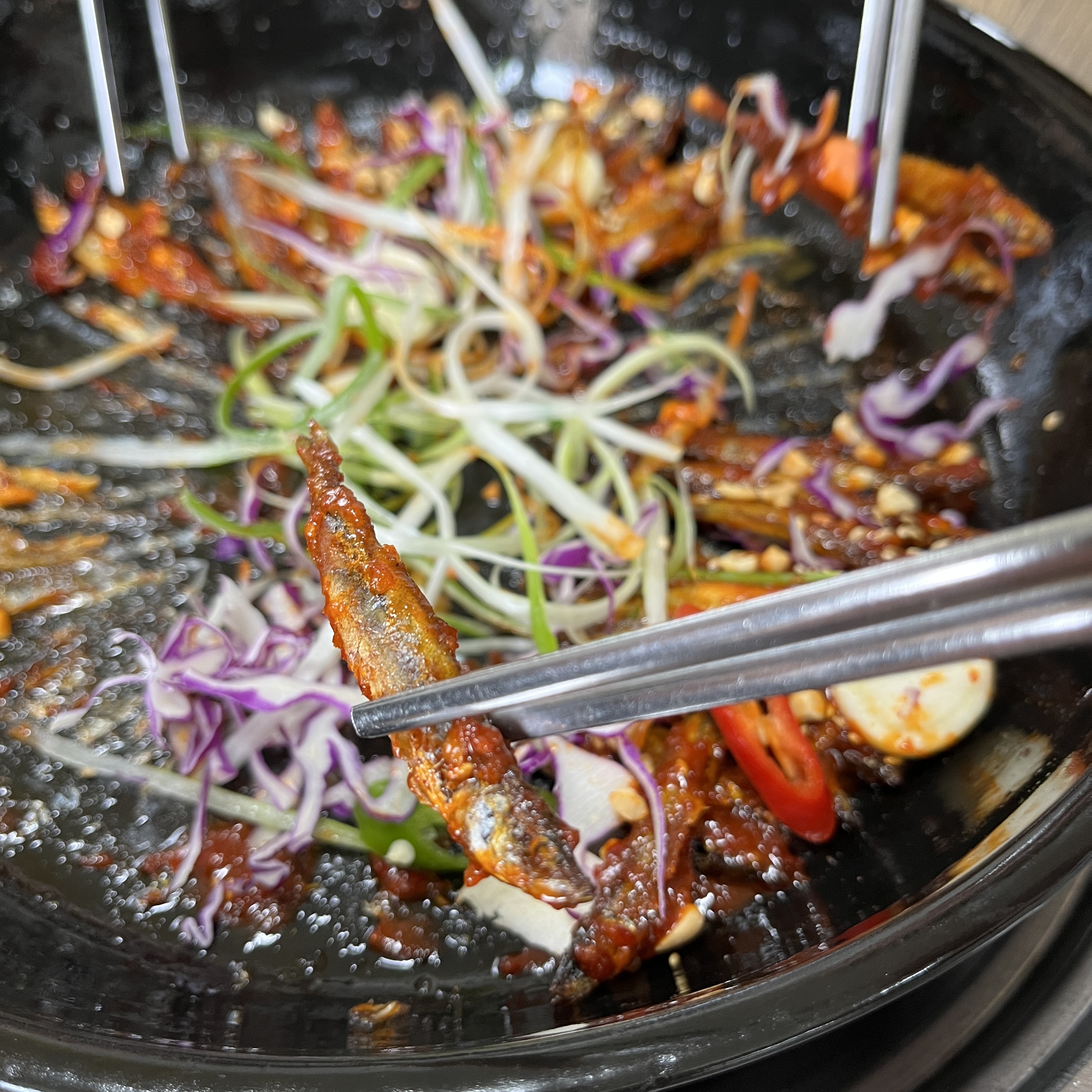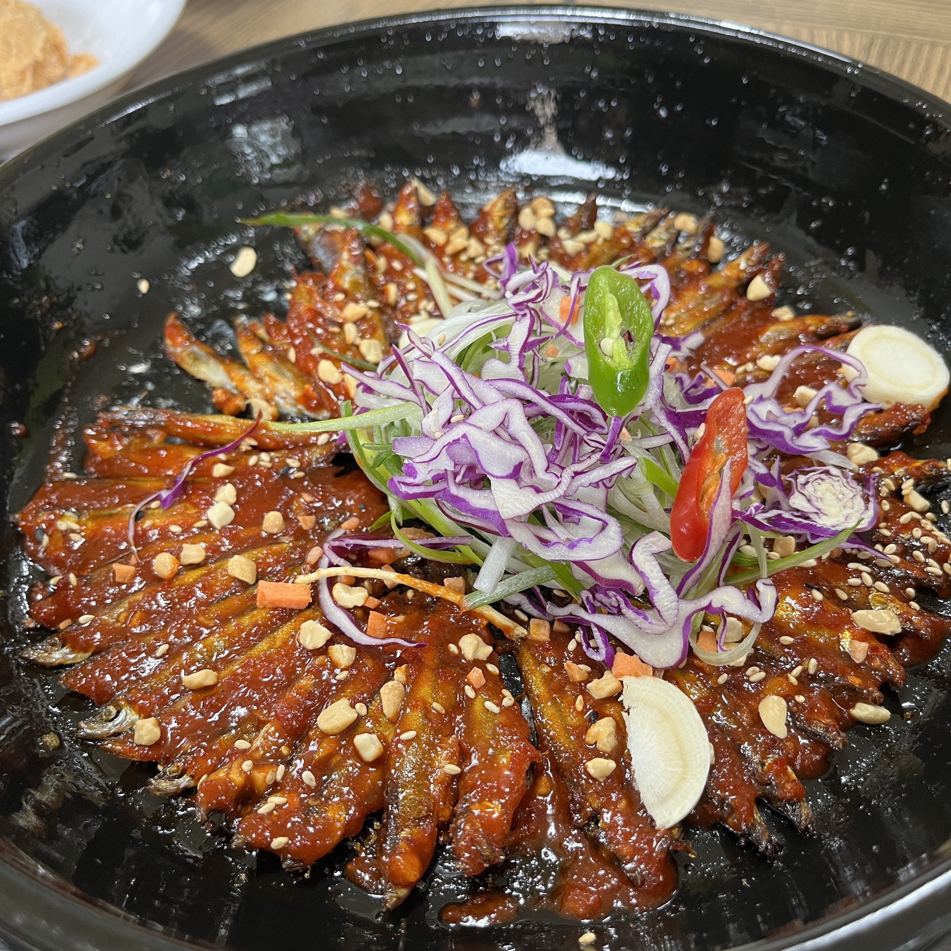 매콤달콤한 소스에 절여져 바삭한 식감이 나도록 익혀진 피래미들이 식감부터 해서 기대가 됐습니다.