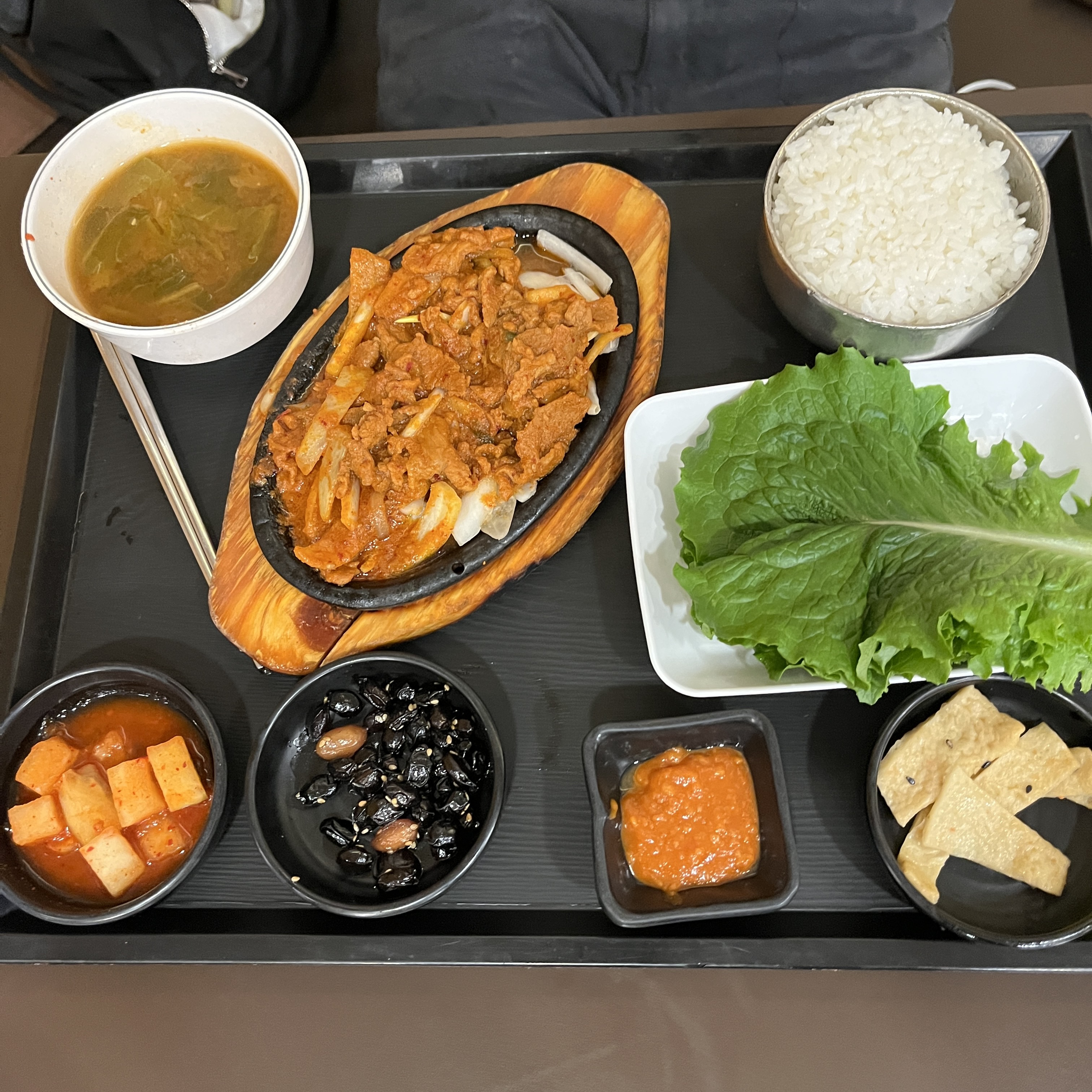 기본으로 제공되는 반찬은 어묵볶음, 콩자반, 깍두기로 김치나베랑 똑같았고, 철판에 제육과 상추 쌈장 그리고 찌개와 밥이 제공됩니다.