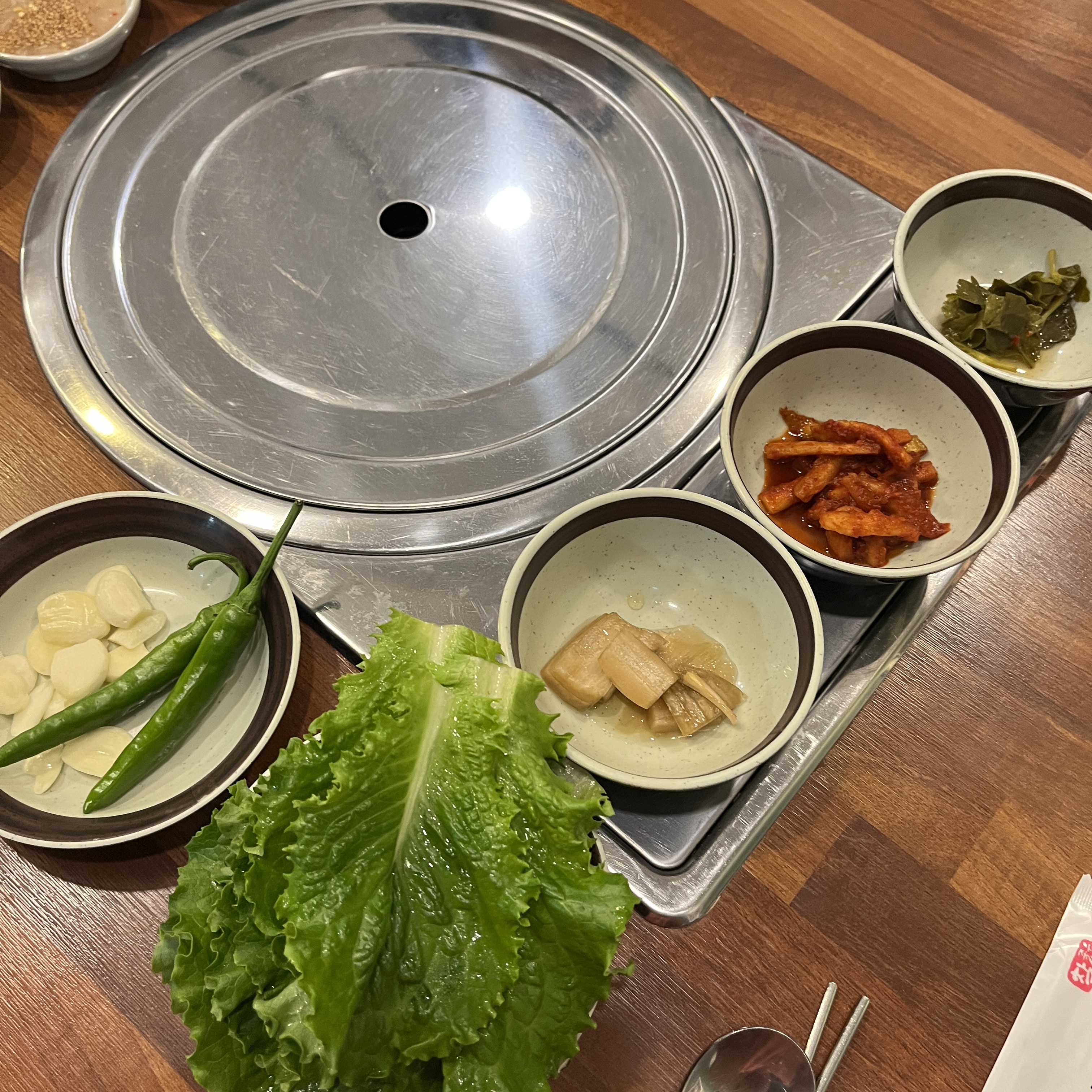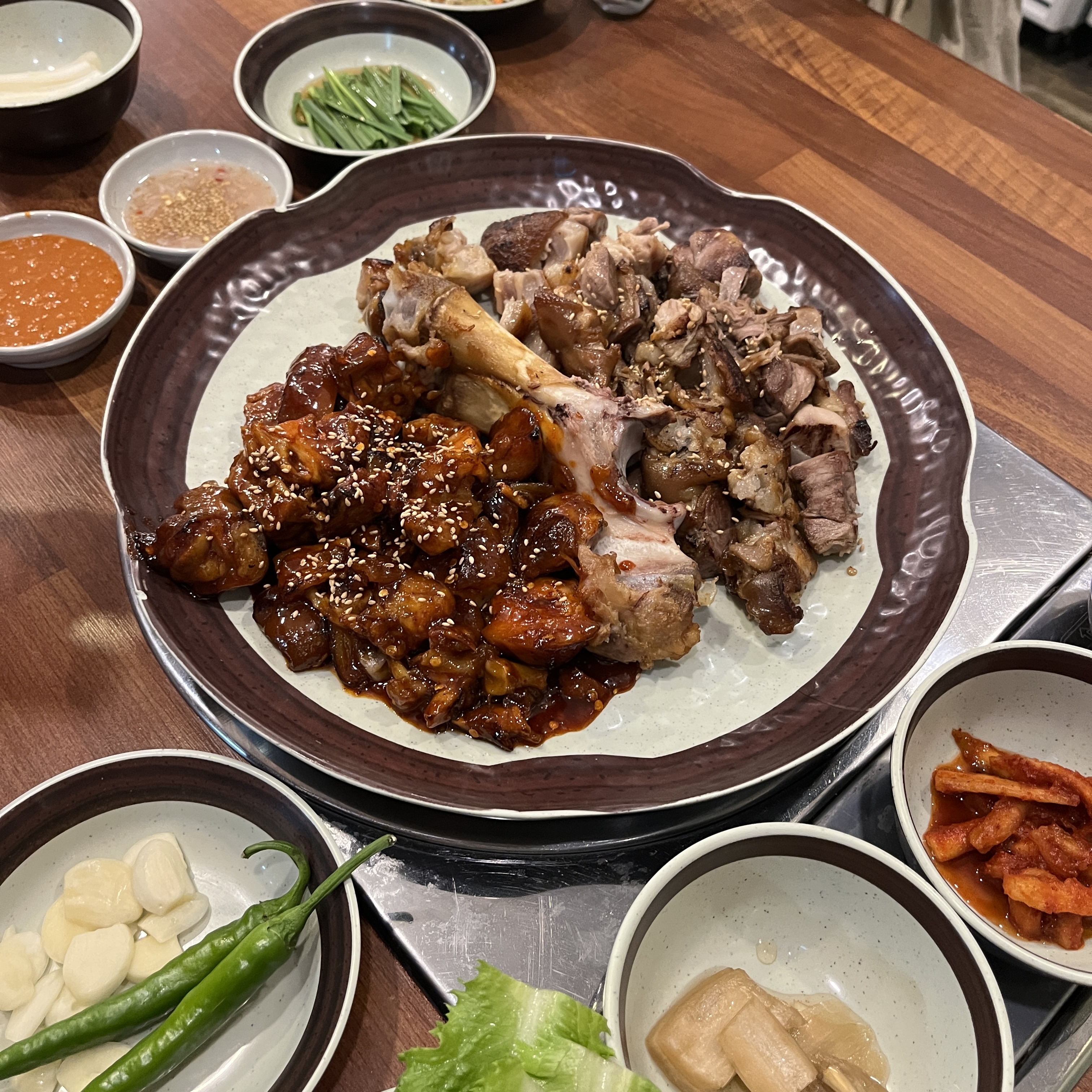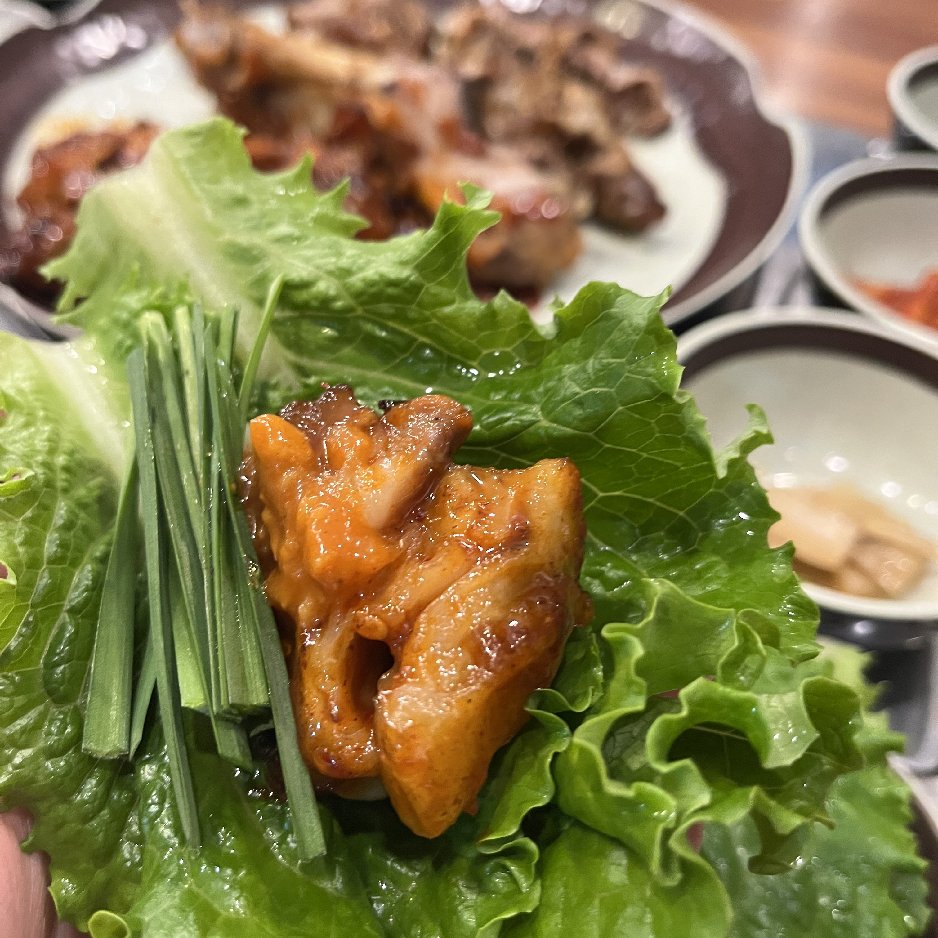 이날의 베스트 조합은 상추, 부추, 쌈장, 거기에 불족발 얹어서 먹는 것이었습니다.