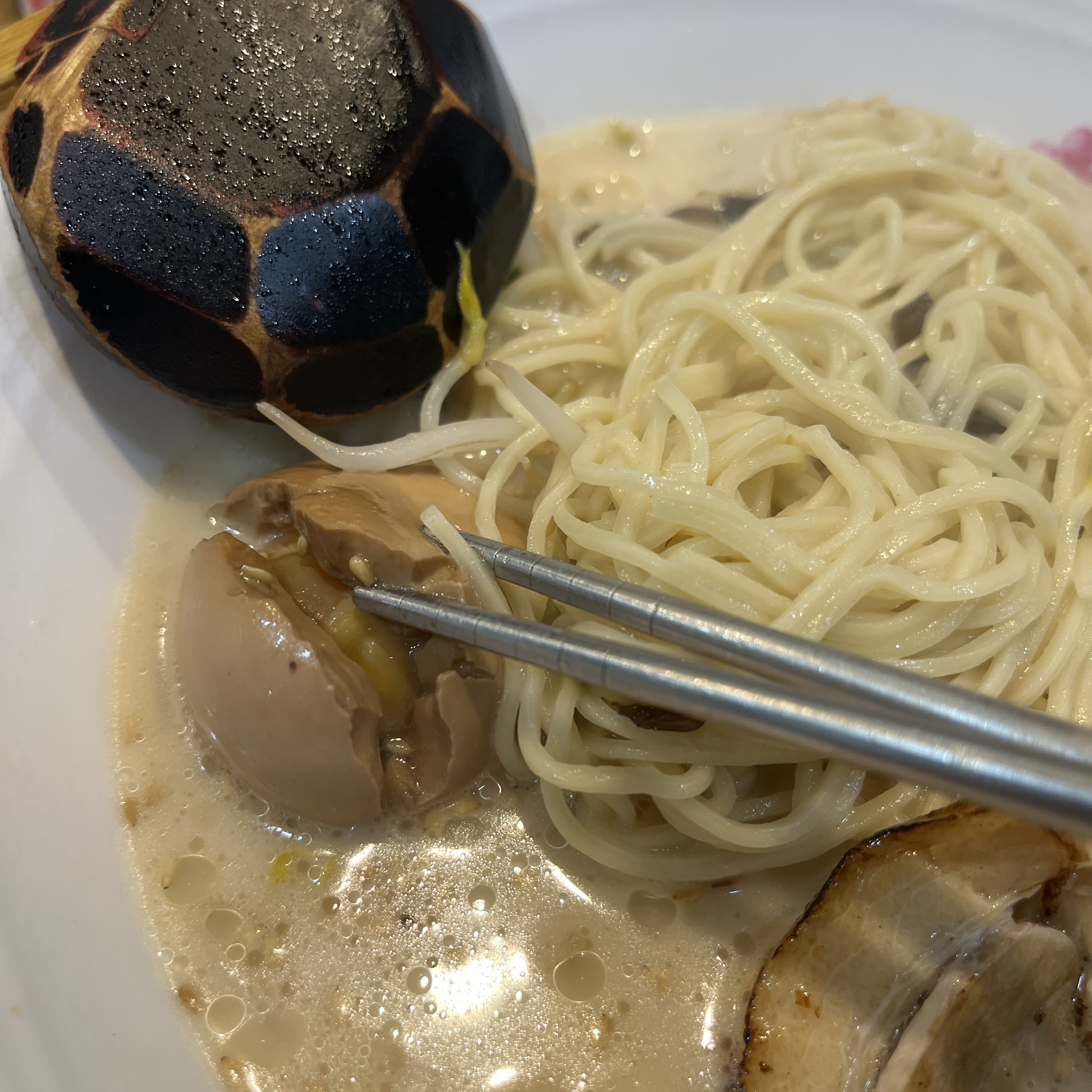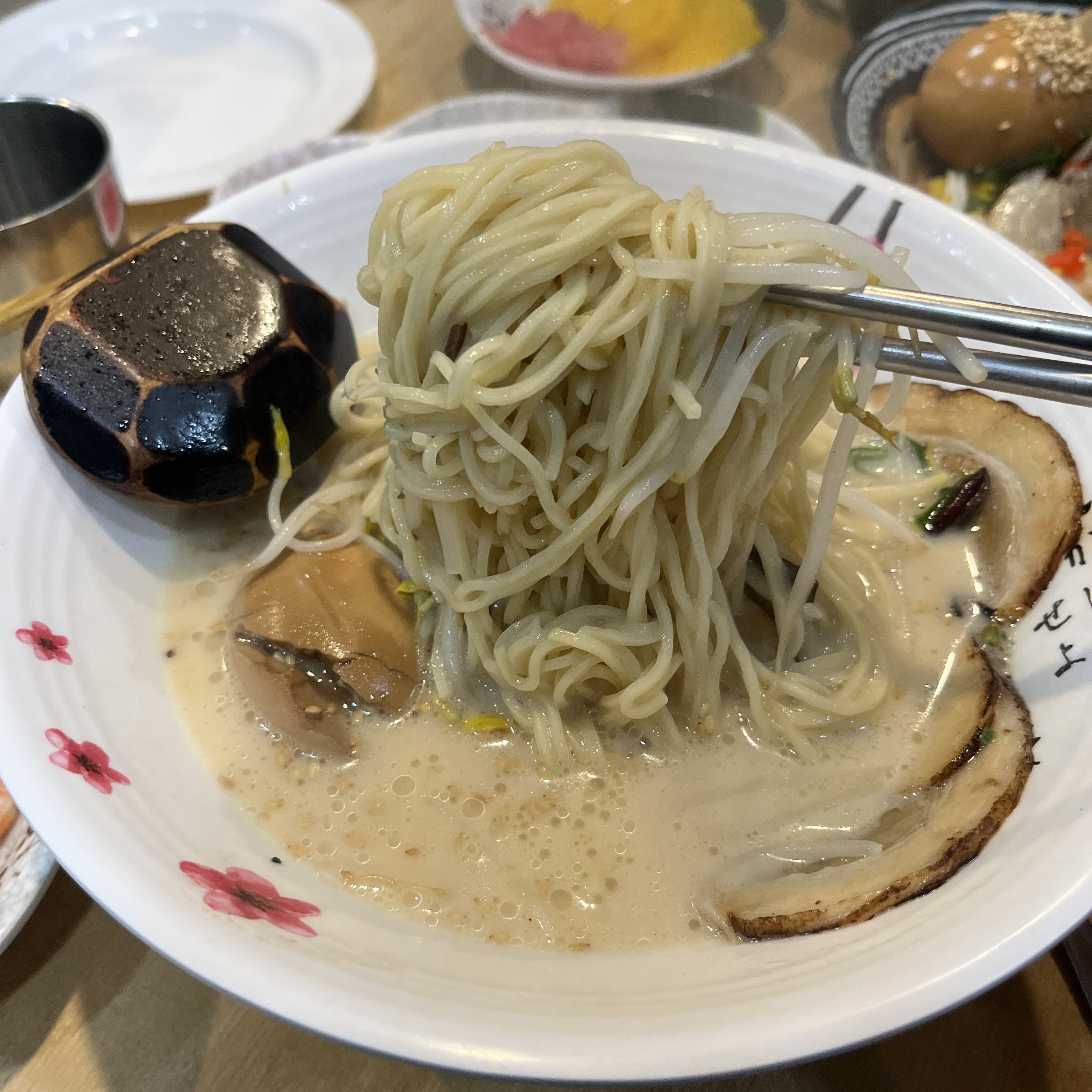 얇디 얇은 면이 쫄깃하기보단 끊어지는 식감같긴 한데, 저게 저 구수한 돈코츠 육수와 진짜 잘 어울립니다.