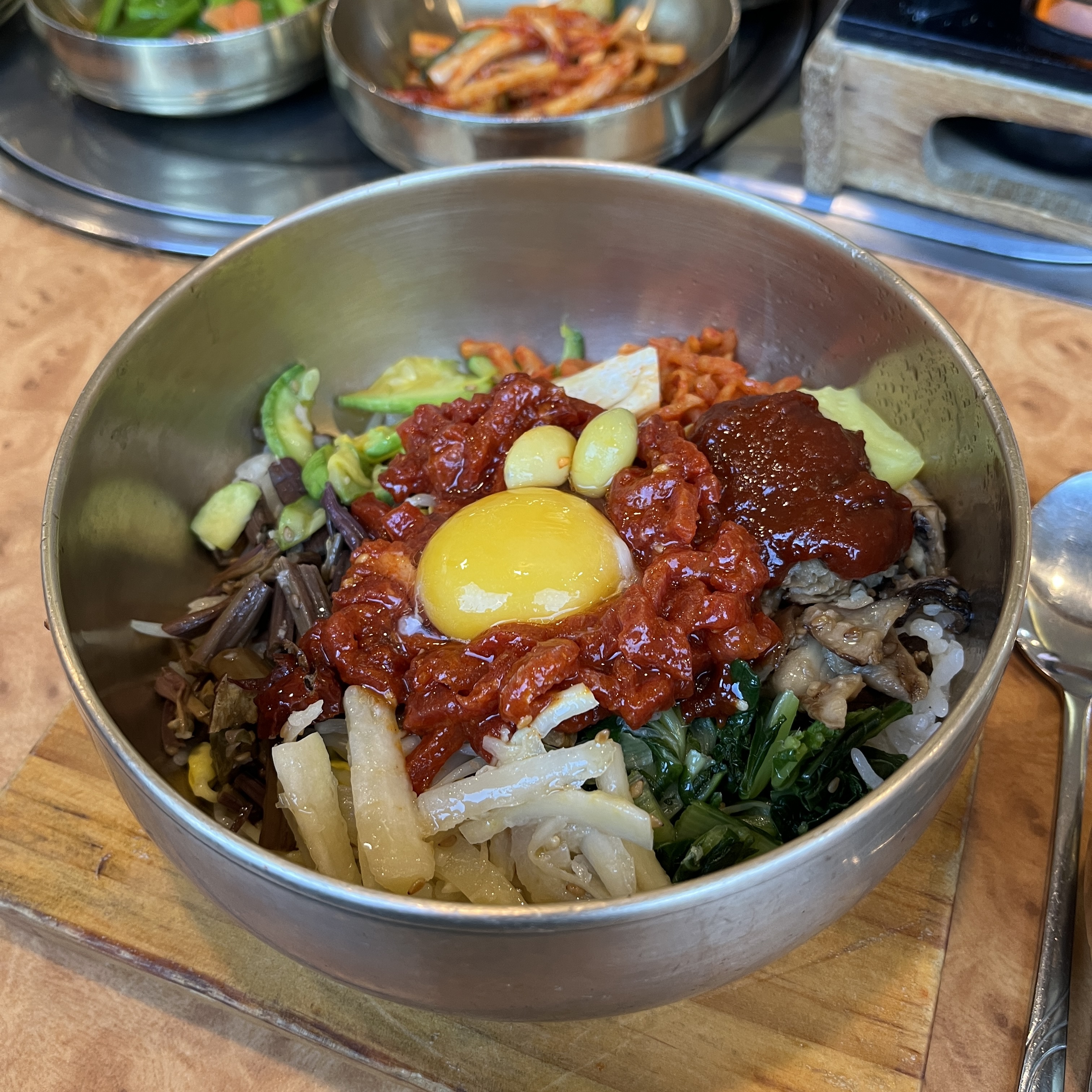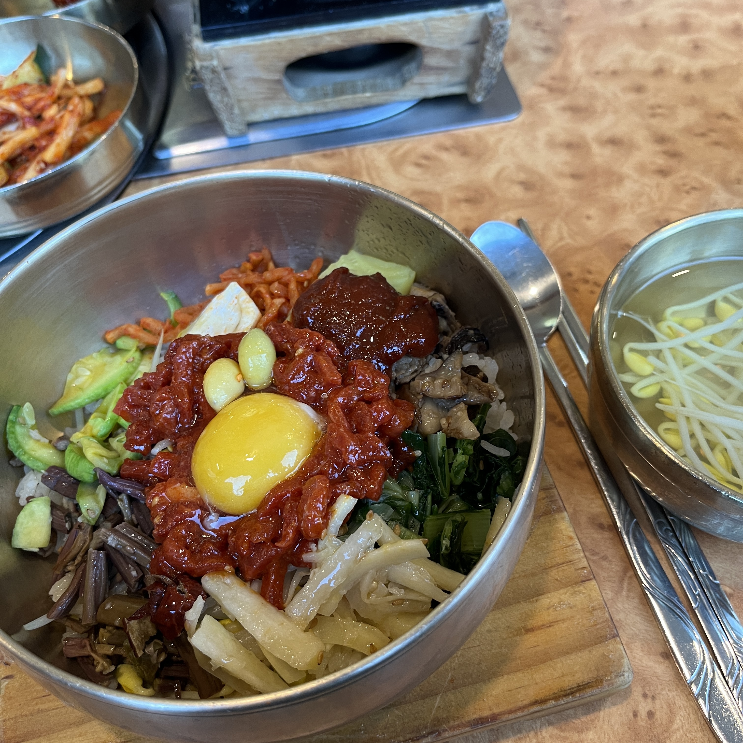 두툼한 녹그릇에서 다양한 나물들과 함께 비벼먹는 비빔밥이 아주 일품입니다~