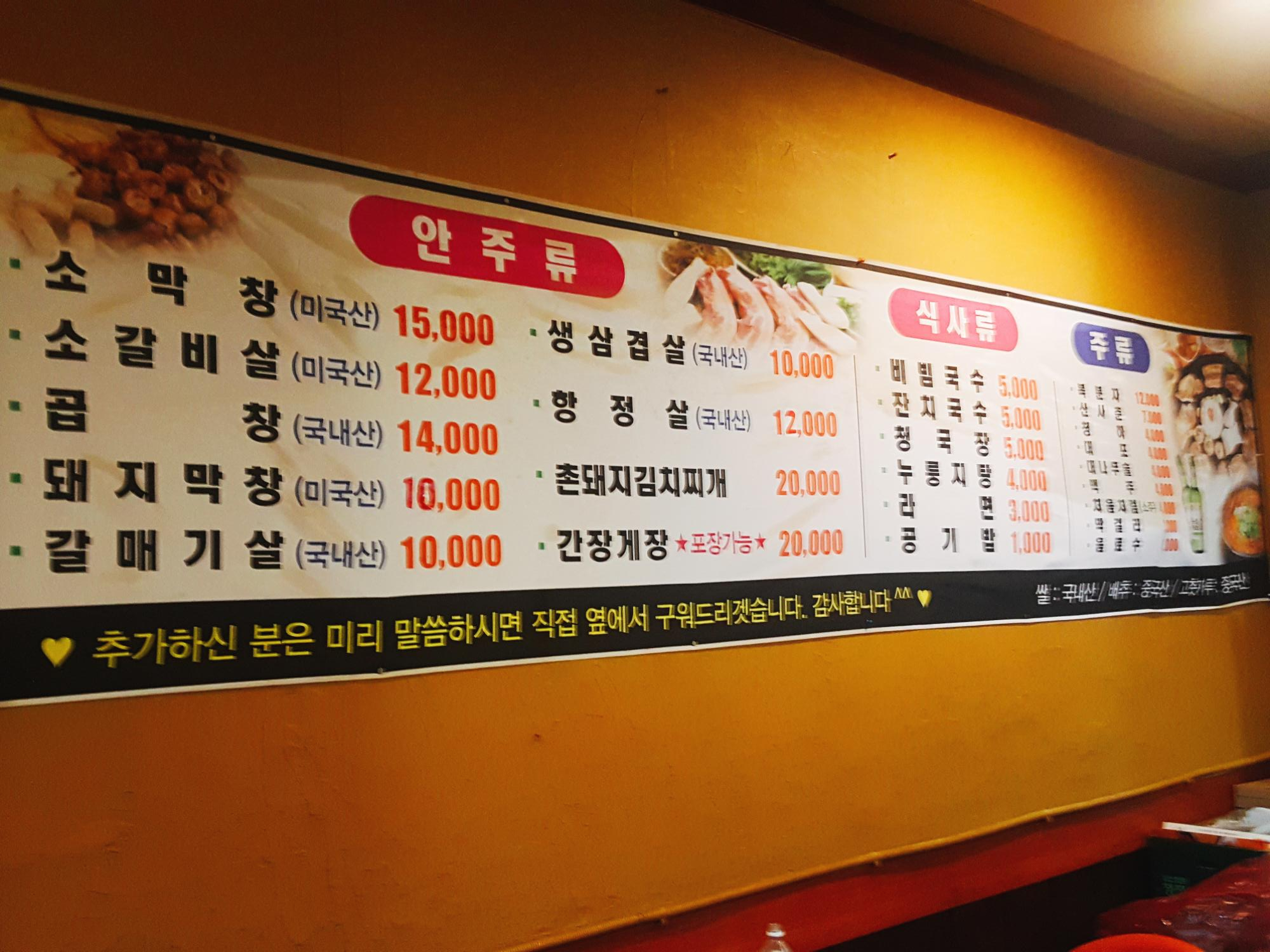 막창 외에 곱창, 소갈비, 갈매기, 삼겹, 항정, 촌돼지김치찌개 등 많은 메뉴를 즐길 수 있으니, 막창 싫어하시는 분들과 함께여도 걱정이 되지 않는 집입니다!