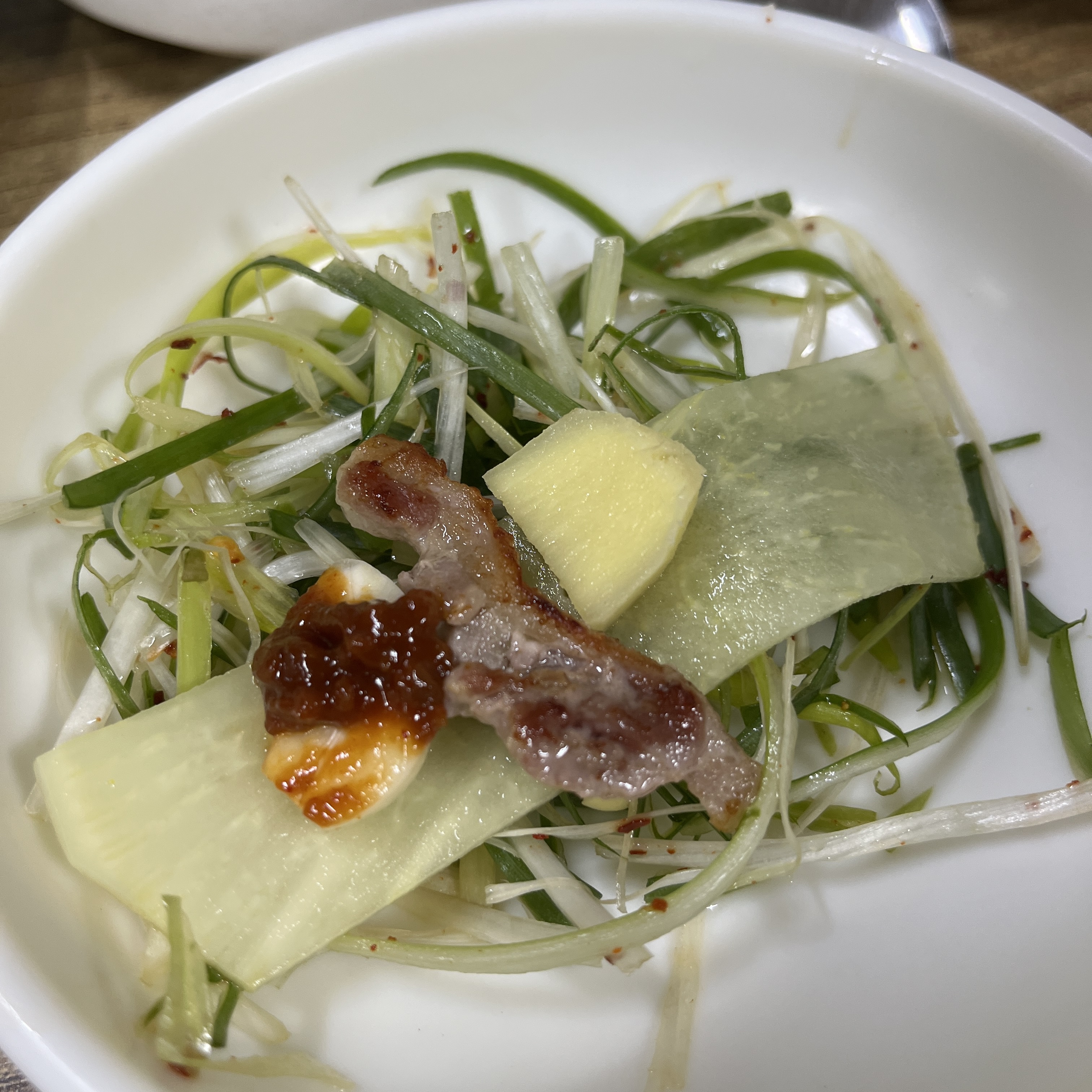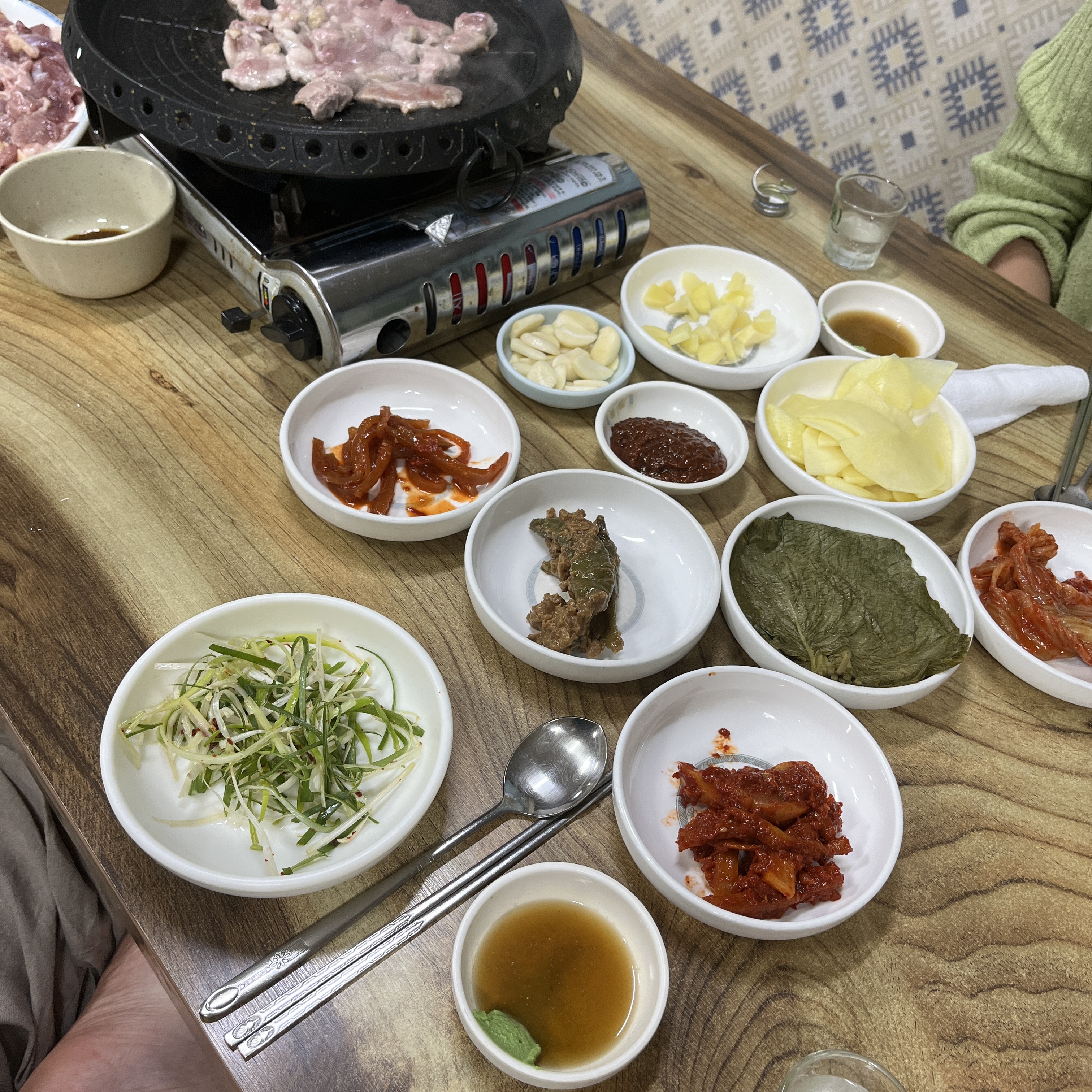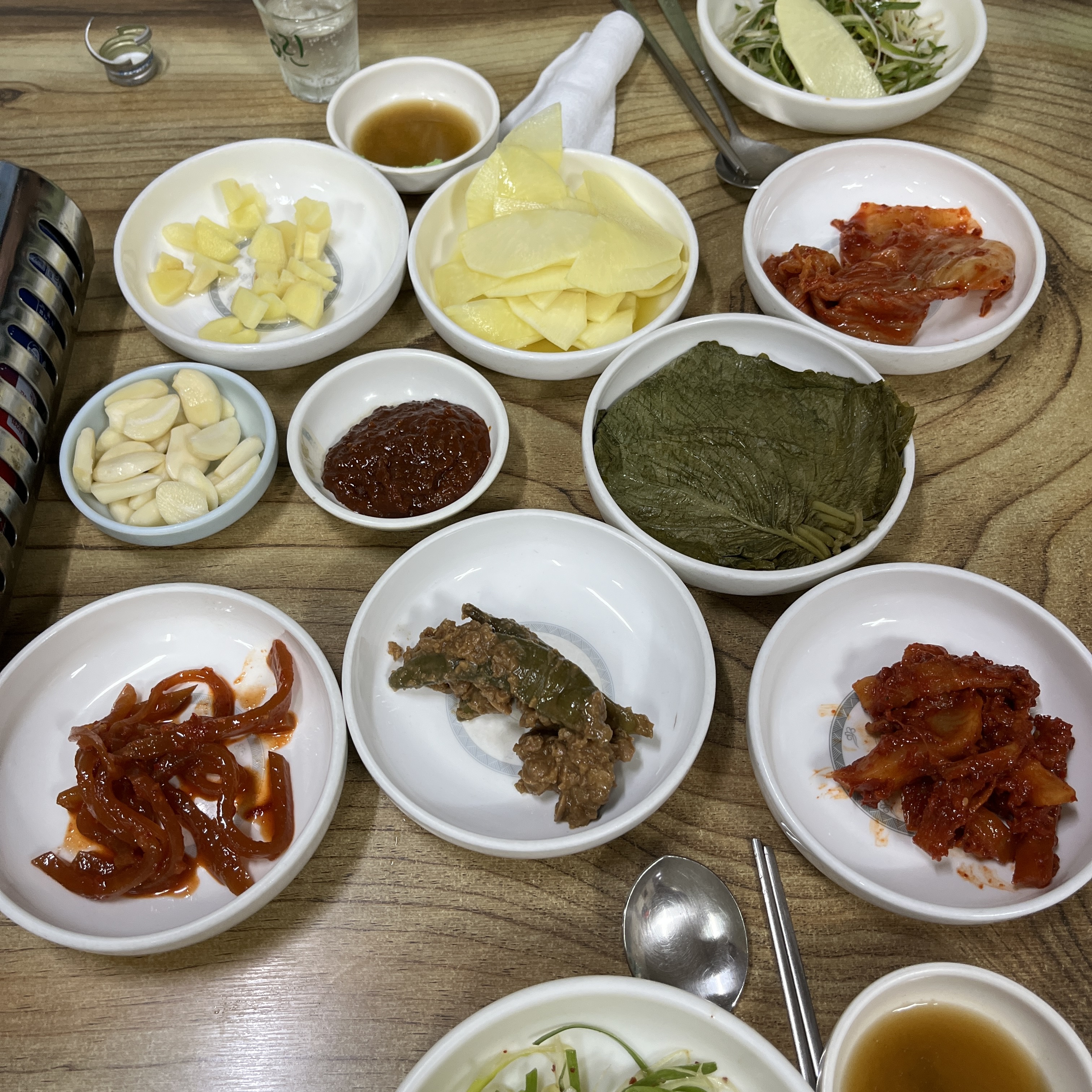 고기는 저어기 생강이랑 같이 먹어도 맛나고요, 쌈무와 마늘 쌈장 한점 얹어먹어도 훌륭해요.