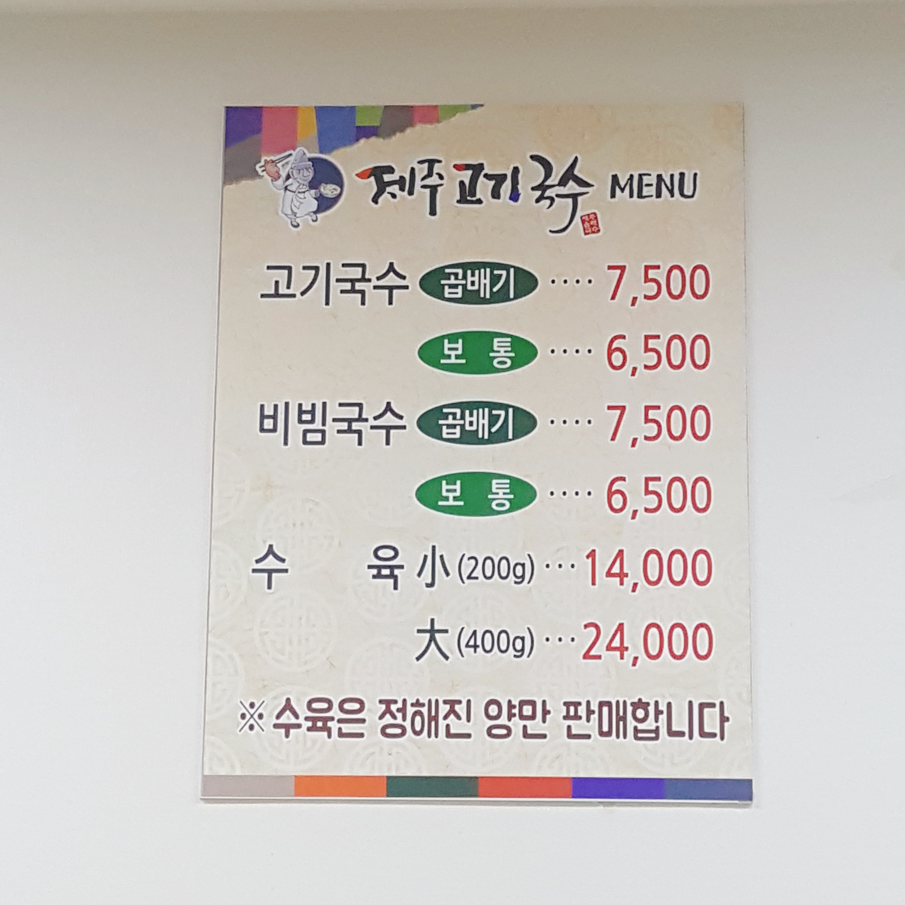 메뉴는 아주 심플합니다. 고기국수, 비빔국수, 수육을 양에 따라 시키시면 됩니다.