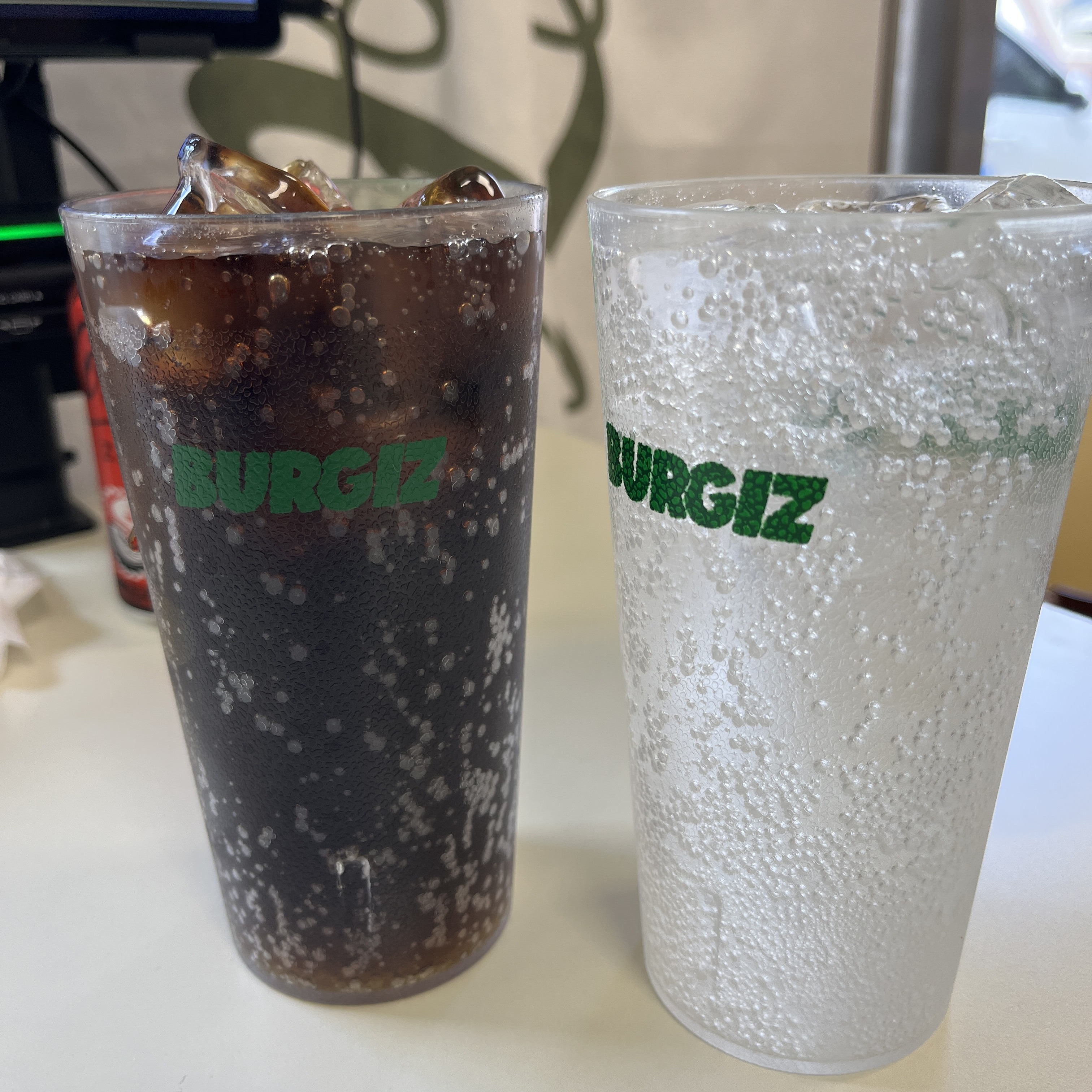 버기즈 로고가 박힌 얼음담긴 플라스틱 컵에