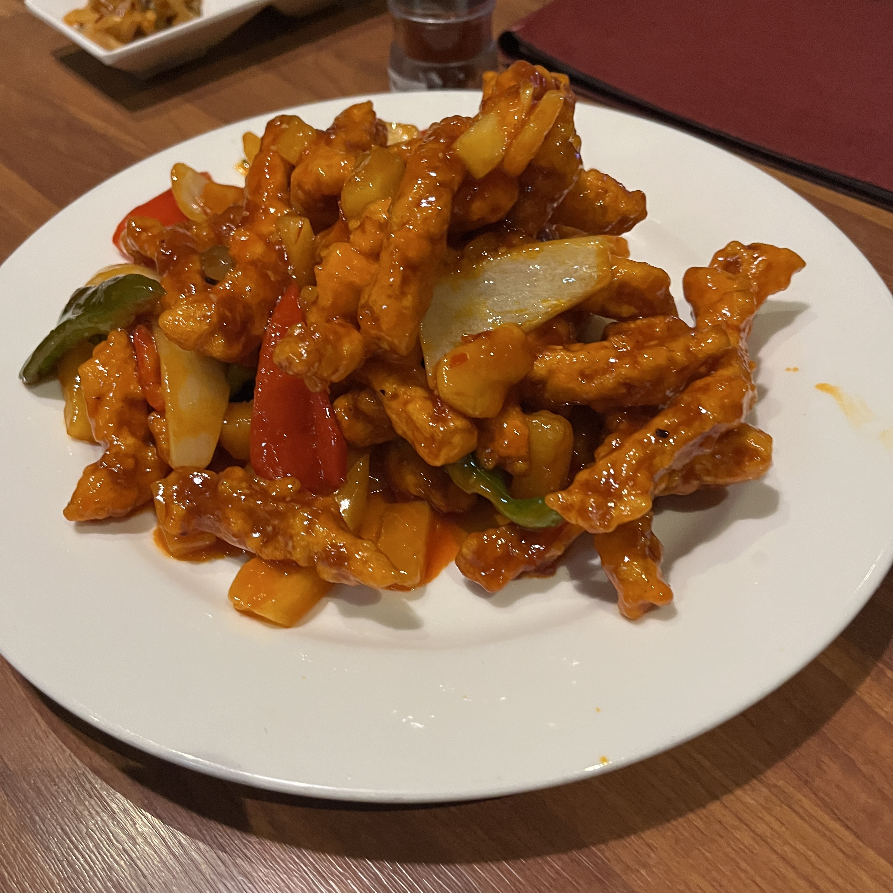 맛은.. 탕수육소스에 매운소스 살짝 첨가하고, 고기랑 죽순 등 재료 넣고 조리한 맛인데,