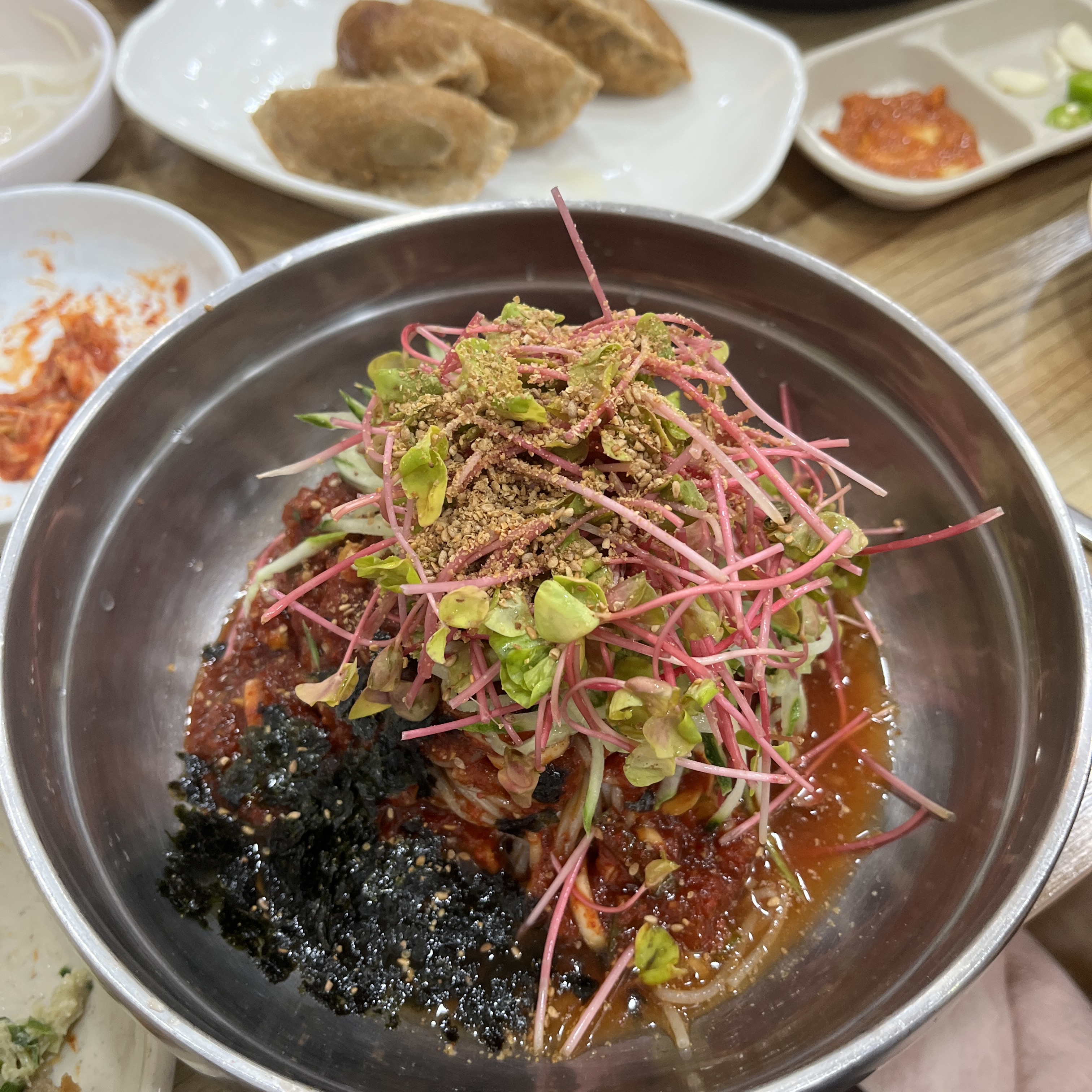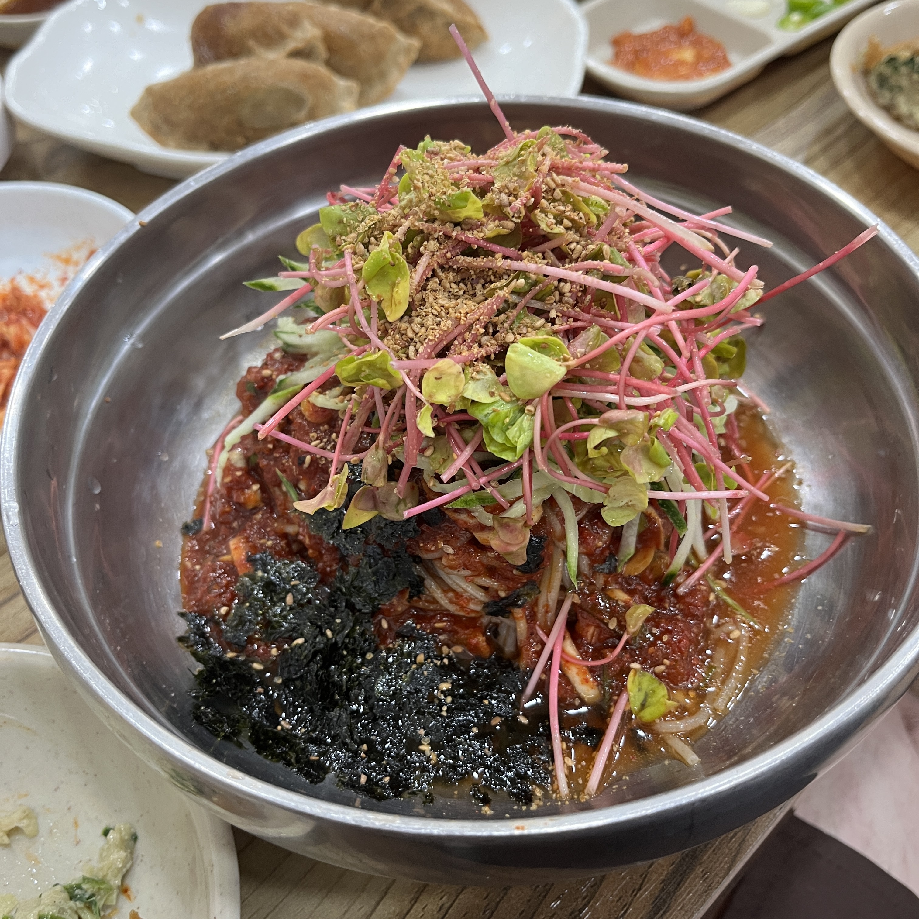 양이 진~~짜 많아요. 세숫대야같은 그릇에 막국수 면이 산더미처럼 쌓여있고, 그 위로 새싹?도 산더미처럼 쌓여있어요.