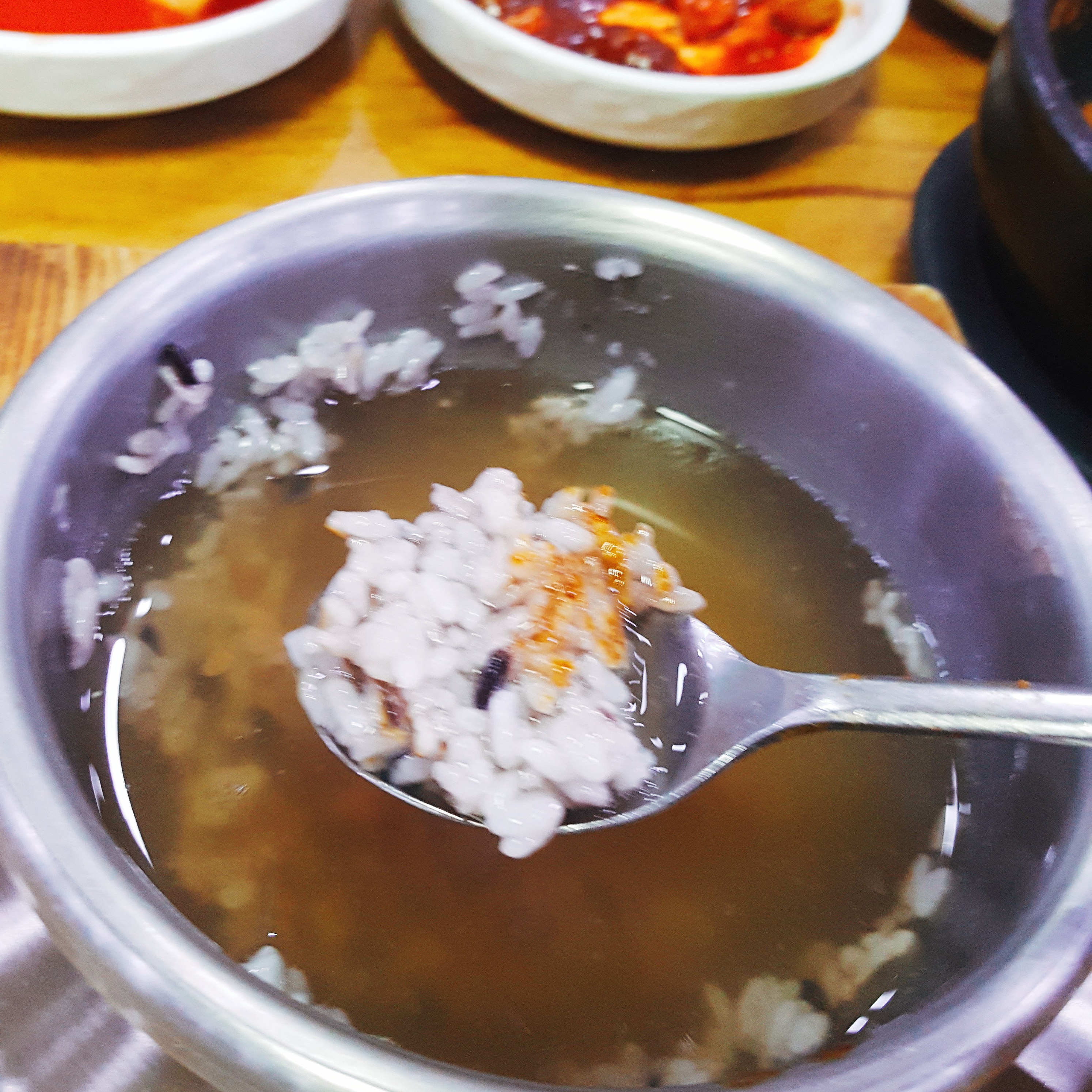 돌솥은 아니지만 각자 밥솥에 밥을 주시면, 우선 밥그릇에 밥을 덜고 주시는 뜨거운물을 부어서 뚜겅을 닫아놓은 뒤, 밥과 추어탕을 어느정도 다 먹고 뚜껑을 열어보면 맛있는 누룽지 숭늉이 완성되어있습니다.